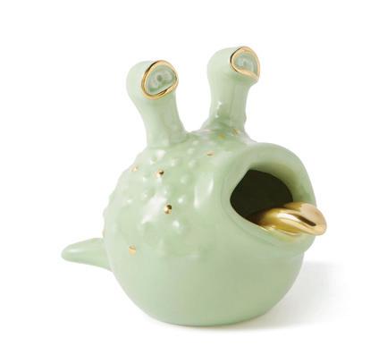 The ‘Grand Gold-Plated Porcelain Ashtray’ is handcrafted from porcelain in the shape of a fantastical creature and illuminated with goldtone spots, eye sockets and a protruding tongue