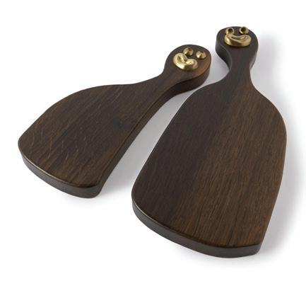 ‘Cheese Louise’ is a set of two wood and goldtone serving boards sculpted in smoked oak with playful gold-tone brass faces on the handles. They slot together as a set or can be placed on the table separately