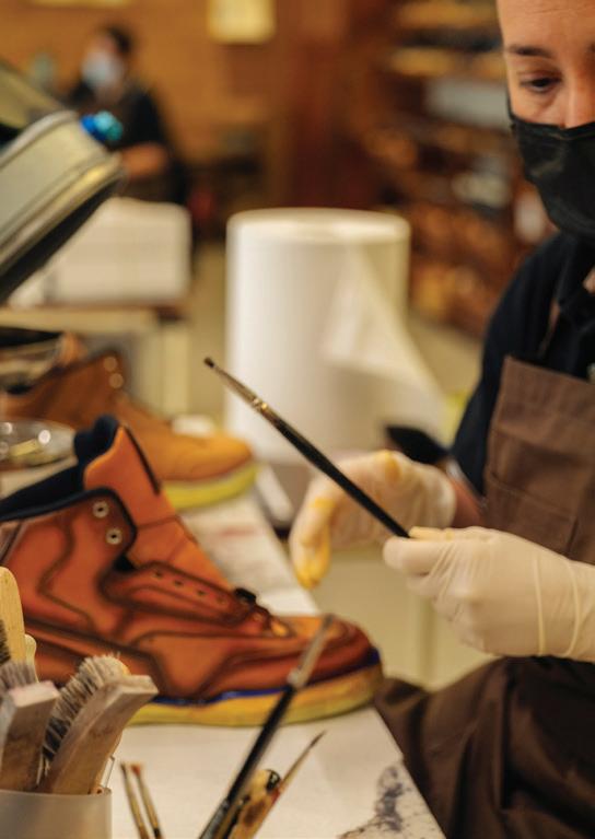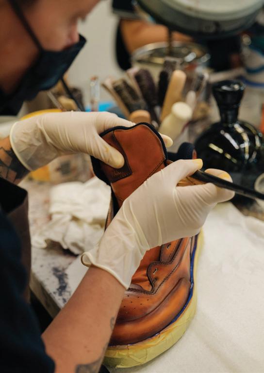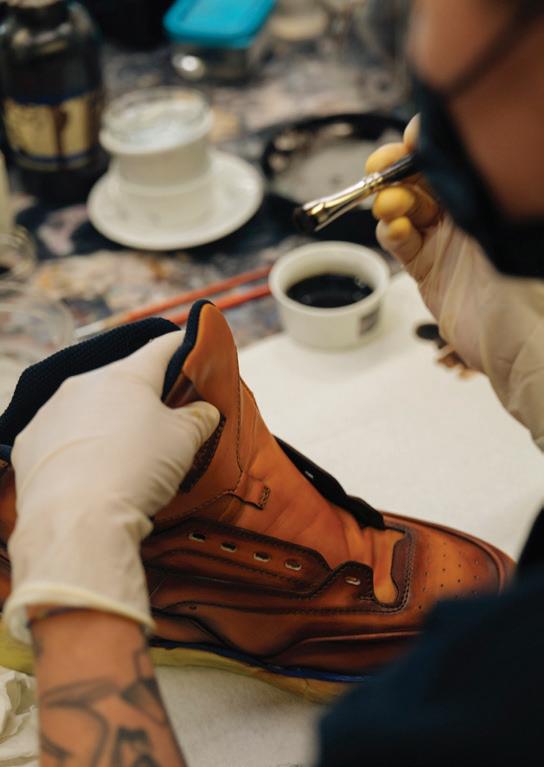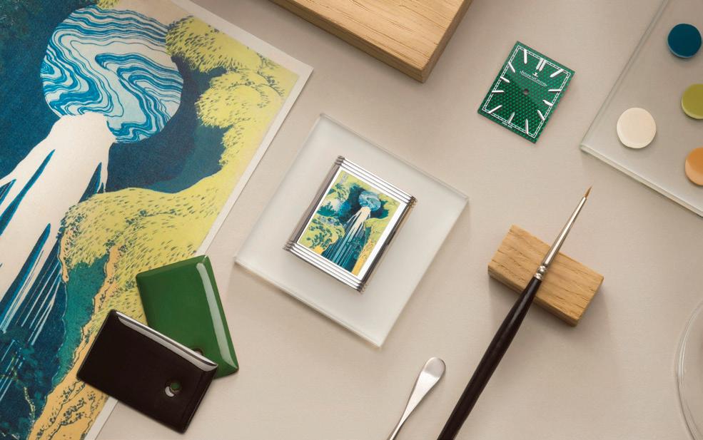 the watchmaking bench, intended to encourage interaction with an inhouse master watchmaker, as well as a custom strap station presenting both engraving and embossing bespoke options along with a Métiers d’Art collection discovery table placed below an iconic dome. A striking blue straw marquetry wall with a Maltese cross motif creates a focal point that conveys Vacheron Constantin’s dedication to high watchmaking artistry.