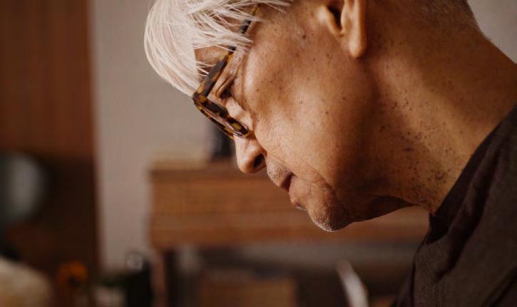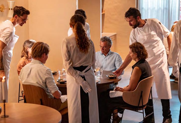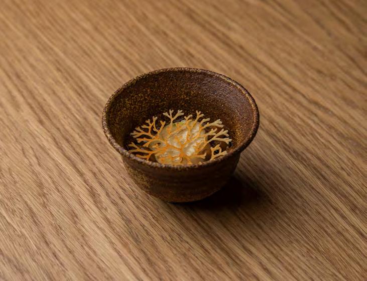 Næste servering byder på sandart. Den er modnet i flere dage beklædt med fla ger af den førnævnte katsuobushi, som bidrager med umami og kompleksitet til sandarten, der serveres i tynde skiver i en vidunderlig bouillon lavet på hvid soja og selvsamme katsuobushi. Samspillet mel lem fisken og de salte, dybe umamismage får det til at slå gnister på øverste etage – og det bliver kun bedre af det flotte vin match, fino-sherry fra El Maestro Sierra, som med sine lette gær- og svampenoter flugter perfekt med retten.