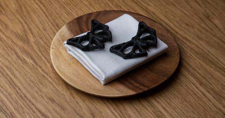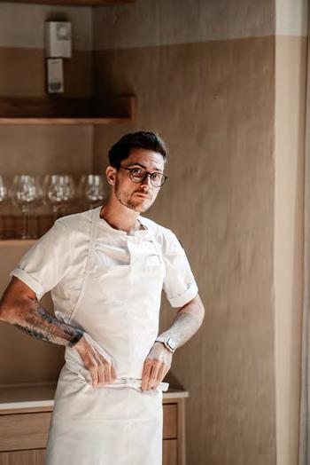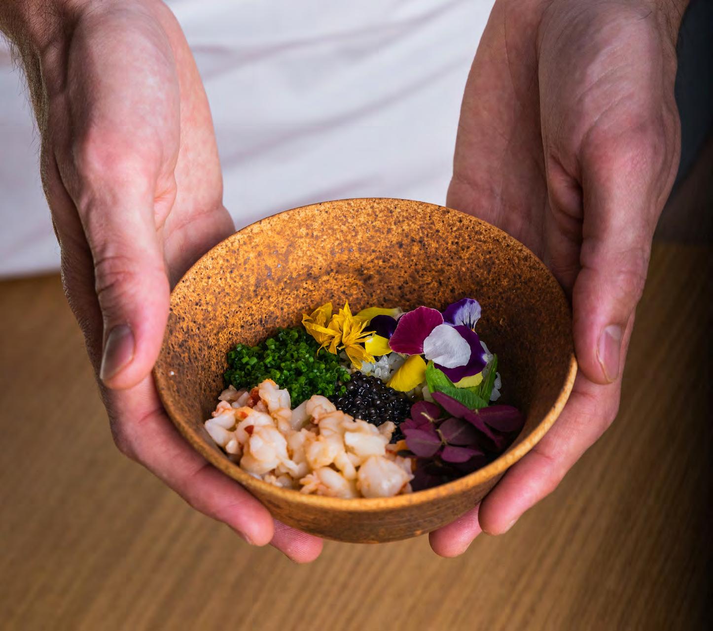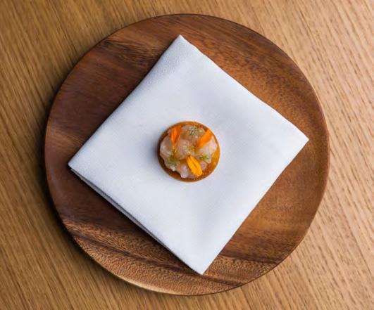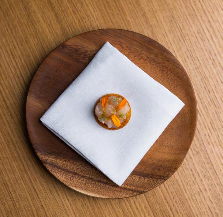 på netop Sicilien. Og med det navn øn sker Gabriele Rizzo at kommunikere, at Hâidan i høj grad har de bedste fisk og skaldyr, han kan skaffe, som omdrej ningspunkt for menuen. Kort efter at vi har fået skænket et dejligt aromatisk glas blanc de blancs-champagne anno 2017 fra Mandois, får vi syn for sagen. Ind kommer fire snacks, som hver især har det til fælles, at de indtager deres rå, mere eller mindre uforarbejdede form. På en sprød, lille cracker ligger en ta tar af jomfruhummer vendt med den italienske krydderpølse nduja. Sødmen fra jomfruhummeren er betagende og balanceres flot af den pikante smag fra pølsen. Næste snack tager udgangspunkt i fisken helt, der – sit navn taget i betragt ning – meget passende tager form af en batmanlignende sprød krustade. Helten er finthakket og vendt med olie af sichu anpeber og har en ren, delikat og subtil smag. Der er dog intet subtilt over det parfumerede shisoblad, som gemmer på sødmefulde, saftige norske rejer, østers og yuzu kosho, en chilipaste lavet med den aromatiske citrusfrugt yuzu – en ve