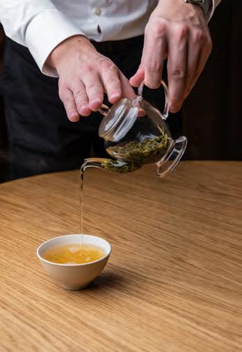 som indledes med hjemmelavet tofu med tørret lavendel og en creme af jordskok ker, mens den sidste søde ret på menuen primært udgøres af en parfait på vanilje samt hibiscus og en sprød tærtebund, som smagsmæssigt minder om en virke lig god gammeldags medalje. Til den vel smagende oolongte af høj kvalitet får vi bl.a. madeleinekager og et udvalg af frisk frugt, som på forfriskende vis runder et endog meget overbevisende og velsma gende måltid af.