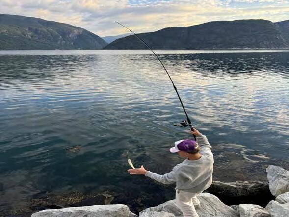 Norge skuffer ikke. En af de sidste dage på turen sidder jeg med den 13-årige og fisker i Hardangerfjorden. Klokken er ikke engang 7.30, og han har allerede hevet de første tre fisk i land. Jeg aner ikke, hvad det er for nogle fisk, men det gør han. De to ryger ud igen, men den store sej skal spises. Han tager den fermt af krogen, slår den med et par velplacerede kranieslag, og så ryger den i en pose. Vi kører ind til byen Eidfjord og finder et bord-bænke-sæt. Mens junior parterer fisken med farmor over FaceTime, fyrer jeg op i den medbragte gasgrill. Vi griller og spiser friskfanget fisk med den smukkeste udsigt til de små 1.000 meter høje bjerge, der tårner sig op over den smalle fjord. Det er ikke ligefrem Camel Trophy råt, men det er markant mere back to the wild