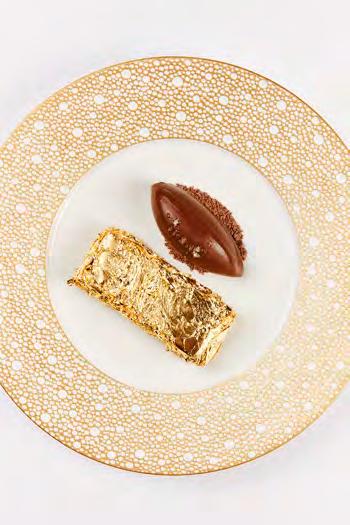 Så er det tid for dessert. I løpet av tiden på Søllerød Kro var Jakob de Neergaard med på å manifestere restauranten som et av landets beste steder for å nyte det søte kjøkken. Han har heldigvis tatt med seg lidenskapen for desserter til hotell restauranten på Kongens Nytorv, slik at man også her kan unne seg noe søtt. Vi lar ikke muligheten gå fra oss, og føler oss trygge når vi overlater til kjøkkenet å bringe et utvalg desserter til bordet. Først en liten terte med mascarpone, fris ke bringebær og bringebæris. Deretter sitronterte med tilhørende bergamottsor bet og en fløyelsmyk sjokoladeplate dek ket av bladgull. Vi får også fornøyelsen av en herlig tiramisu fra d'Angleterres nye