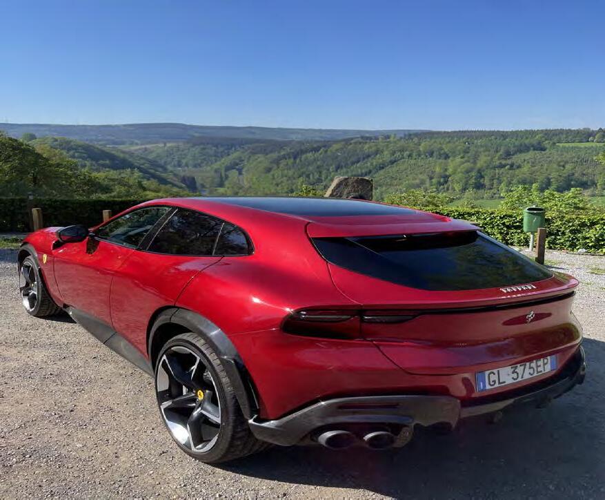 Nok om alle dilemmaene. Til syvende og sist må spørsmålet om bilens berettigelse avgjøres bak rattet. Jeg går ut av hotellet i Maastricht og får stukket nøklene til en rød Purosangue i hånden. Ikke en ekte Ferrari-rød, men en metallic Rosso Mugello 325. Jeg starter bilen. Den begynner med den motorlyden man forventer av en Ferrari. Forventningen til dagen stiger mens jeg ser meg omkring i kupeen. Den er pen. Den er logisk. Instrumentpanelet er digitalt. Grafikken er lekker. Bilens kjøreprogrammer hjelper deg til å styre motorens krefter. Ice, wet, comfort og sport – og den helt ville: ESC off. Ferrari har laget en rute fra Maastricht i Nederland gjennom det skogkledde og kuperte området Ardennene i Belgia og til racerbanen i Spa. Det er kjøring på motorvei og offroad – gjennom små pittoreske byer, på lange, rette landeveier og svingete fjellveier. Perfekte forhold for å teste bilen. Ruten kommer via Apple CarPlay opp på instrumentpanelet. Jeg kjenner på meg at dette blir en god dag.