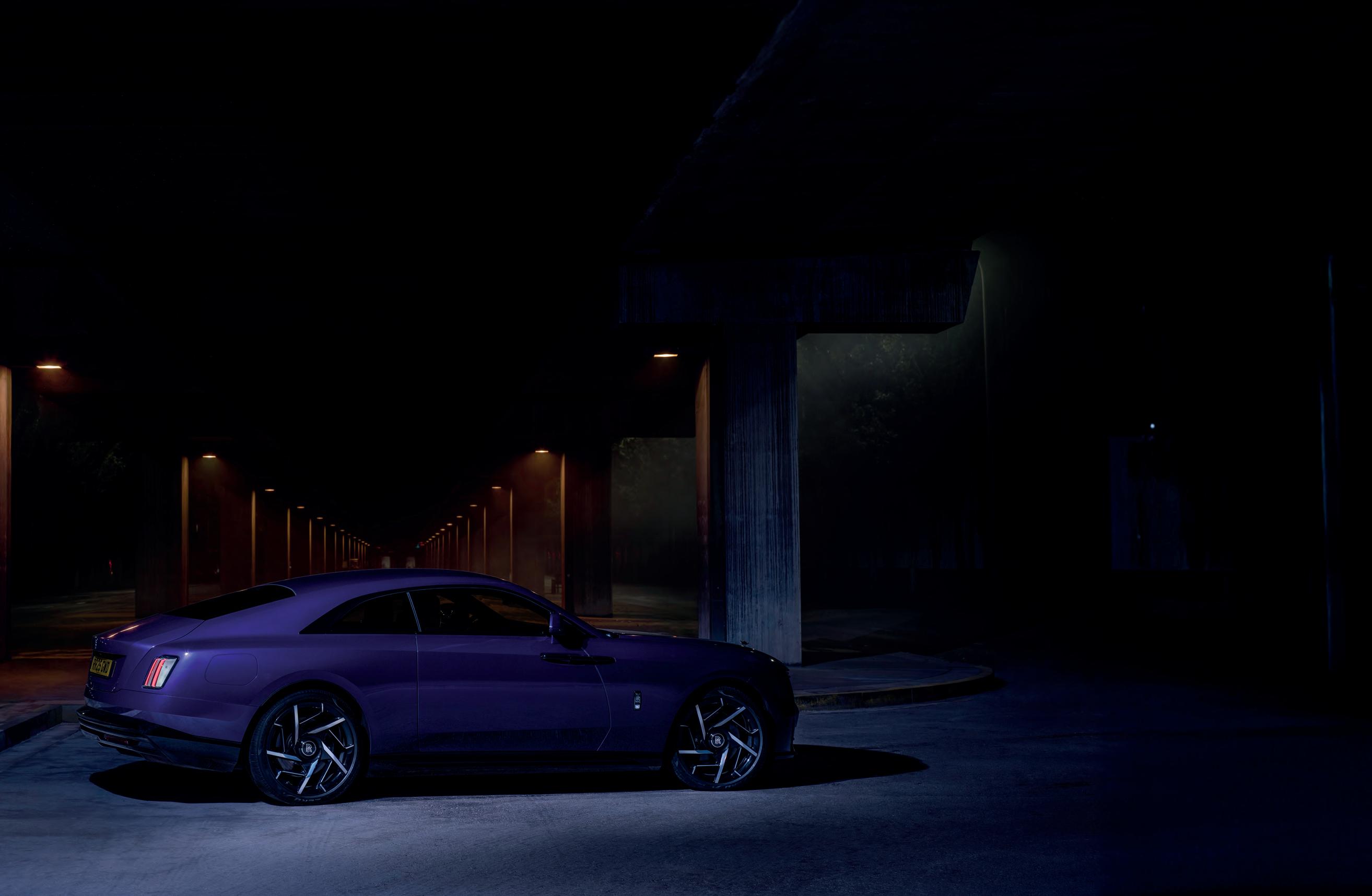 Førsteinntrykket etterlater en følelse av å stå ansikt til ansikt med en skurk fra et science fiction-univers. Black Badge Spectre bærer Rolls-Royces klassiske design-DNA – den majestetiske Pantheon-grillen, de ikoniske coach-dørene og det uendelige panseret – men i dette eksemplaret er den pakket inn i dyplilla lakk.