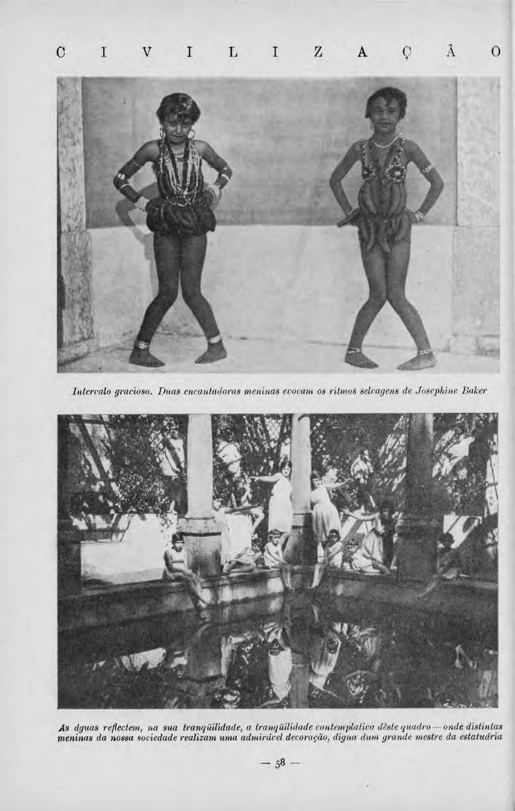 a geometria do jardim neoclássico; a fotografia A Alma das Rosas expõe a beleza de mademoiselle Inês da Câmara Machado, «admirável realizadora de bailados interpretativos», lembrando uma Pavlova ou uma Karsavina; a dança oriental aparece ingenuamente numa fotografia de um trio de jovens que se equilibram no rebordo de um laguinho artificial; e Josephine Baker é lembrada na fotografia do jovem dueto «intervalo gracioso».