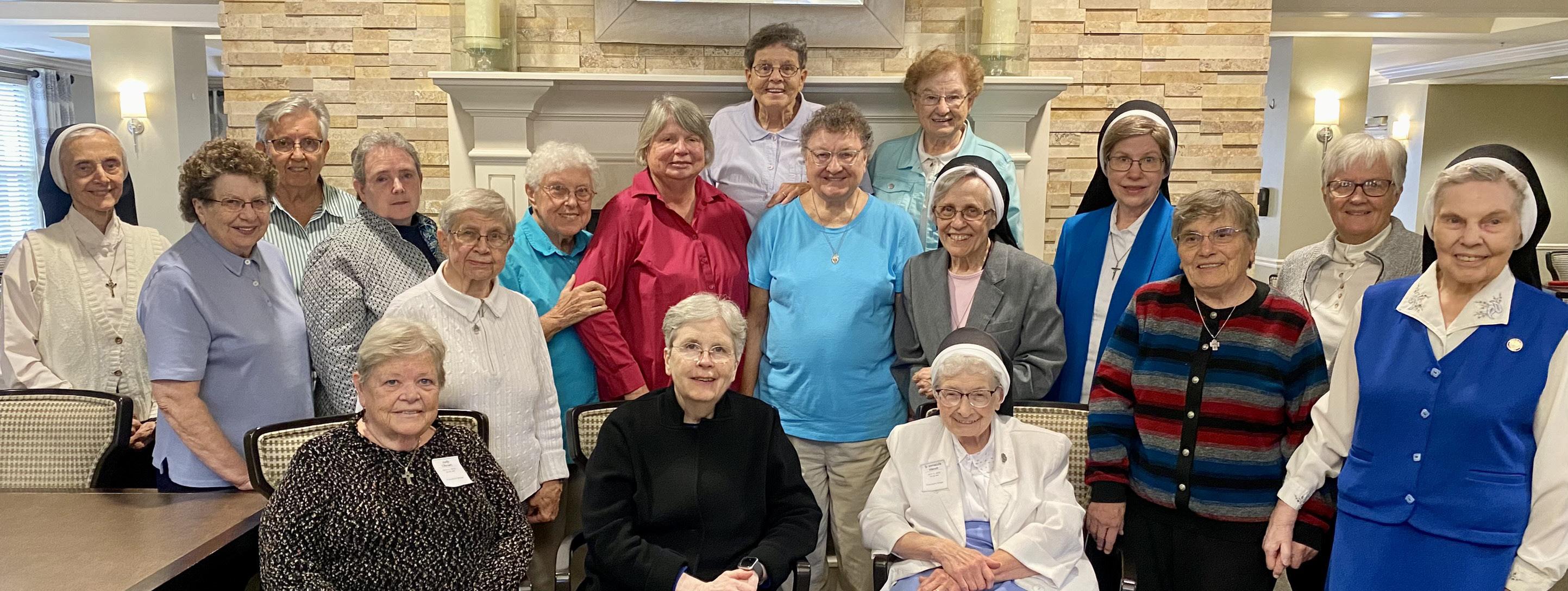 Sisters gather after the Jubilee luncheon at Franciscan Village, Lemont, IL. From left, sitting: Sr. Elenisa Buzas, Sr. June Puishys, Sr. Elaine Kuizinias, Sr. Lawrence Puishys, Sr. Leandra Yerkes, Sr. Margaret Zalot, Sr. Zita Petkevicius. Standing, from left: Sr. Nancy Streitmatter, Sr. Mary Louise Andrulonis, Sr. Dolorine Lopez, Sr. Juline Revas, Sr. Janine Golubickis, Sr. Deborah Romanuski, Sr. Virginia Gapsis, Sr. Bernadette Marie Janus, Sr. Rita Marie Kerdock, Sr. Sylvia Puchoras, Sr. Theresa Papsis, Sr. Marilyn Karpovich, Sr. Margaret Petcavage, Sr. Immacula Wendt, Sr. Elizabeth Ann Yocius, and Sr. Lenore Thomas, IHM.