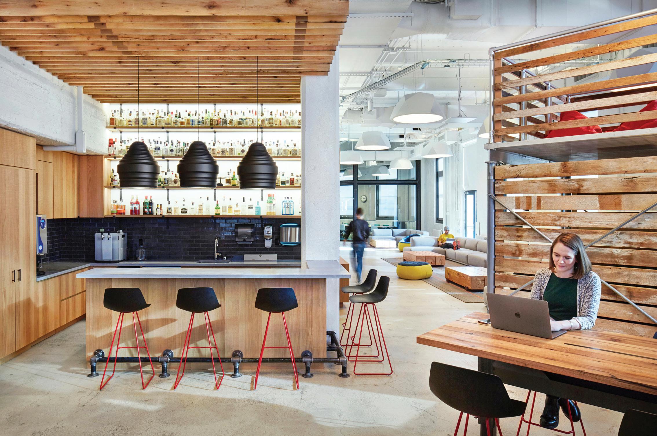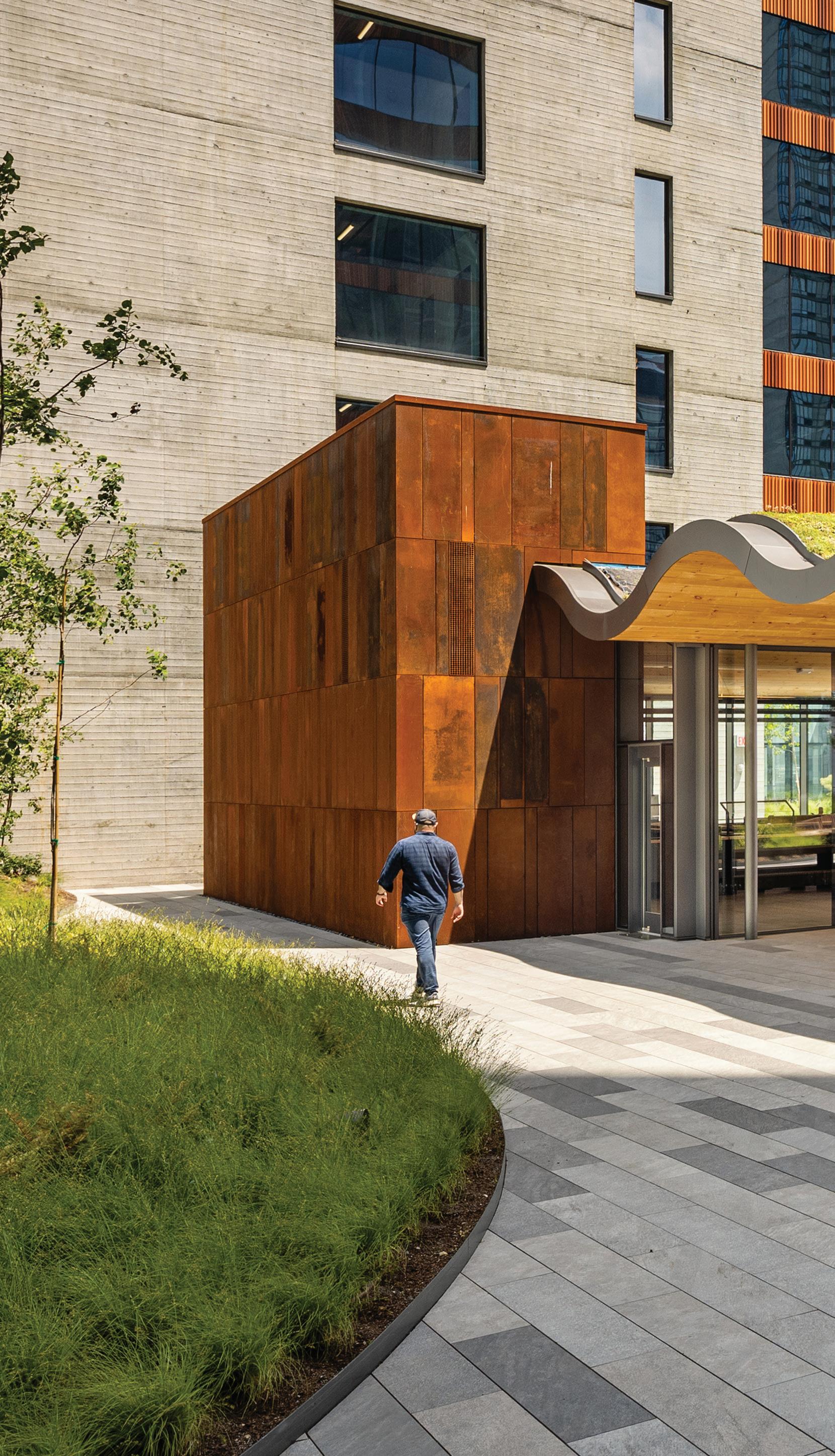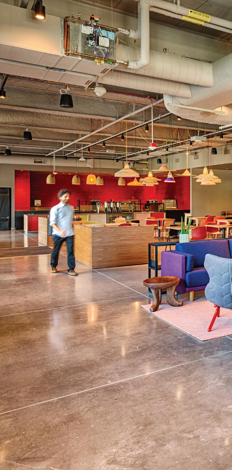 On the second floor, the buildings are interconnected via shaded walkways, creating a continuous circulation route that weaves indoors and outdoors together. This elevated “street” includes pantries, lounges and informal meeting spaces that are key elements of a new hybrid office landscape. The strategic placement of these collaboration spaces along circulation paths encourages the cross-pollination of ideas between teams and communitybuilding throughout the campus. Focused workspaces are recessed deeper within the buildings, ensuring heads-down work can be free from distraction.
