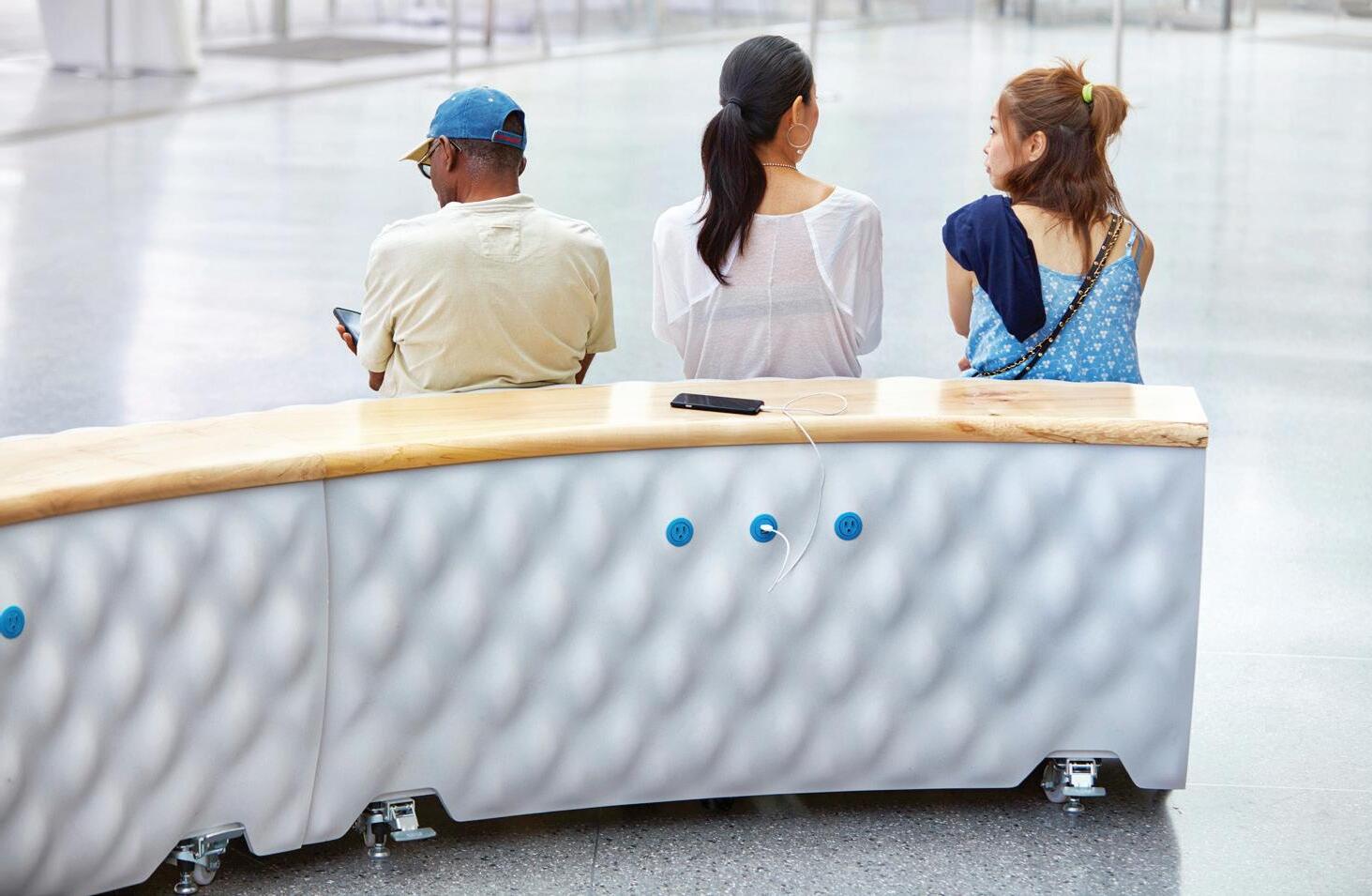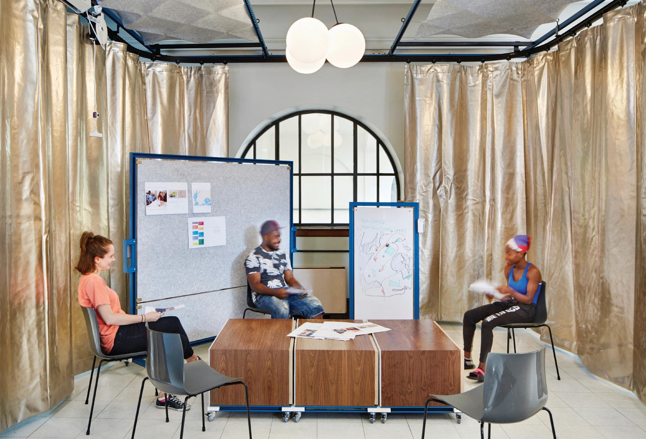 Building upon techniques developed in the textile industry for folding and gathering, a system of flexible fabric canopies disrupt and animate the columns that once ordered the space. These artistic interventions, combined with thermoformed benches and tables, create a unique forum for public interaction and assembly within this ever-evolving institution.