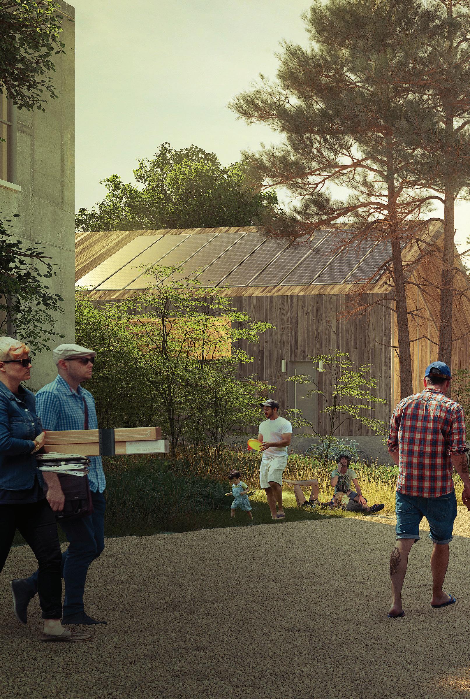 Drawing from placemaking approaches to public space, the central courtyard and interstitial exterior spaces are the main organizing features of the campus. Through a variety of both social and work-related programs integrated into the landscape design, the courtyard serves as a town plaza flanked by cafes, event spaces and meeting rooms, where the most activity is concentrated.