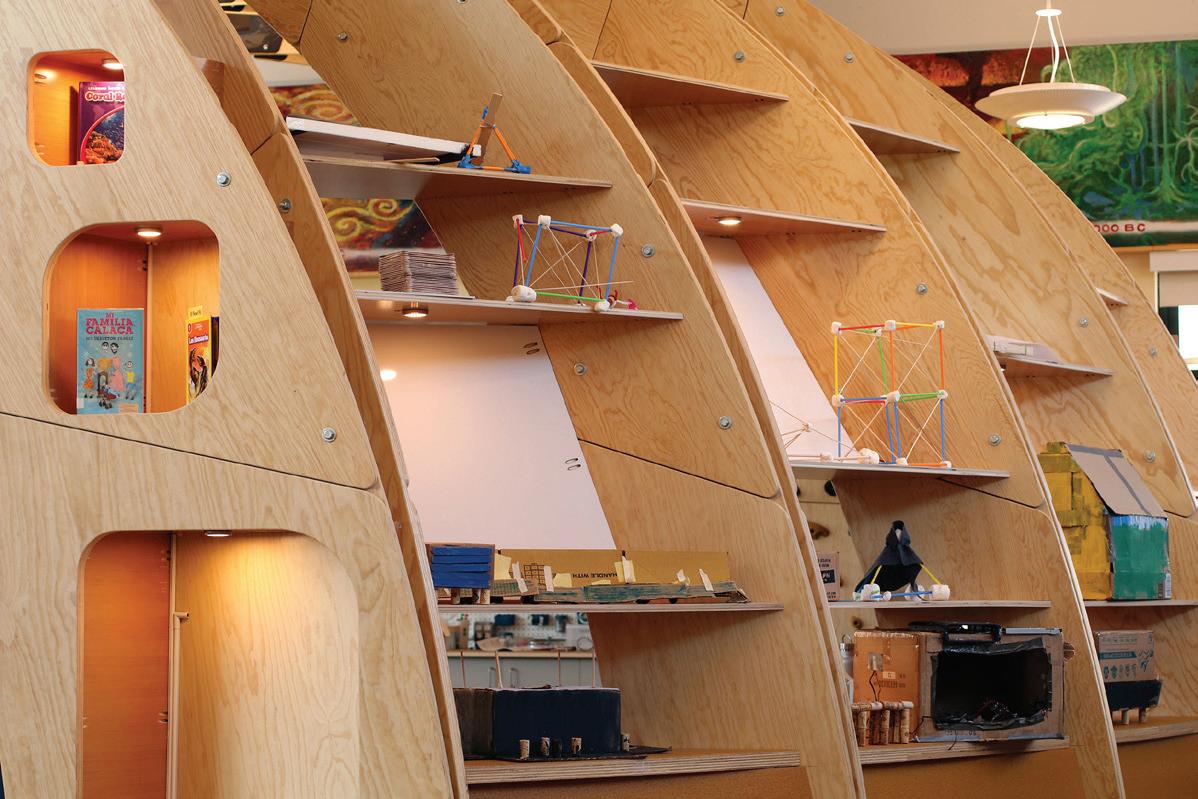 Anchored by a prehistoric-looking rib structure, our design leverages this feature to create a dialog between workspace and book stacks, while providing storage for a variety of ideation tools, such as whiteboards, an iPad, books and—importantly—student work on display. Work surfaces and mobile tables at several different heights serve students across the age spectrum. Shared spaces as well as tucked-away nooks allow kids to learn and work within their own style and at their own pace. Throughout the space, we left construction methods clearly visible, to spark inquiry as well as to inspire students as they design and build within.
