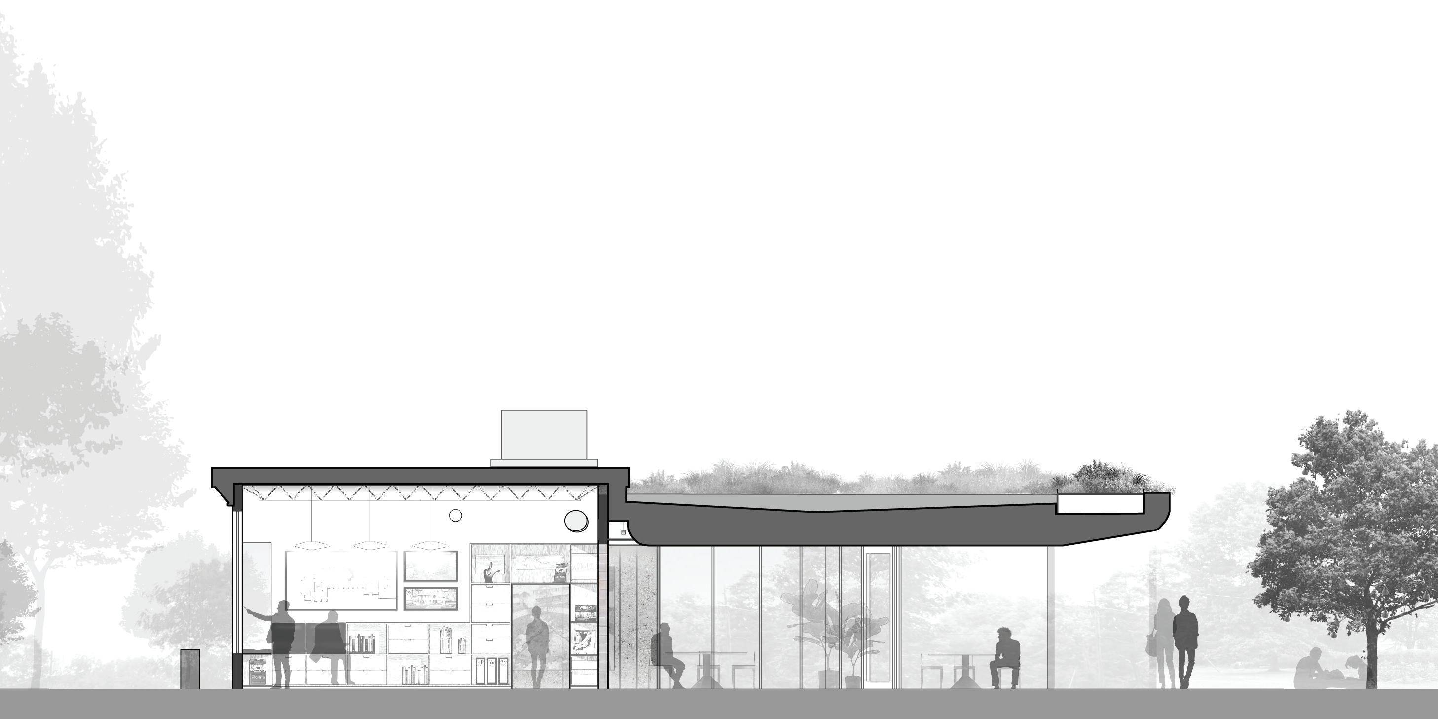 Section of the visitor center, showing the gradual transition from the interior offices to the exterior gardens