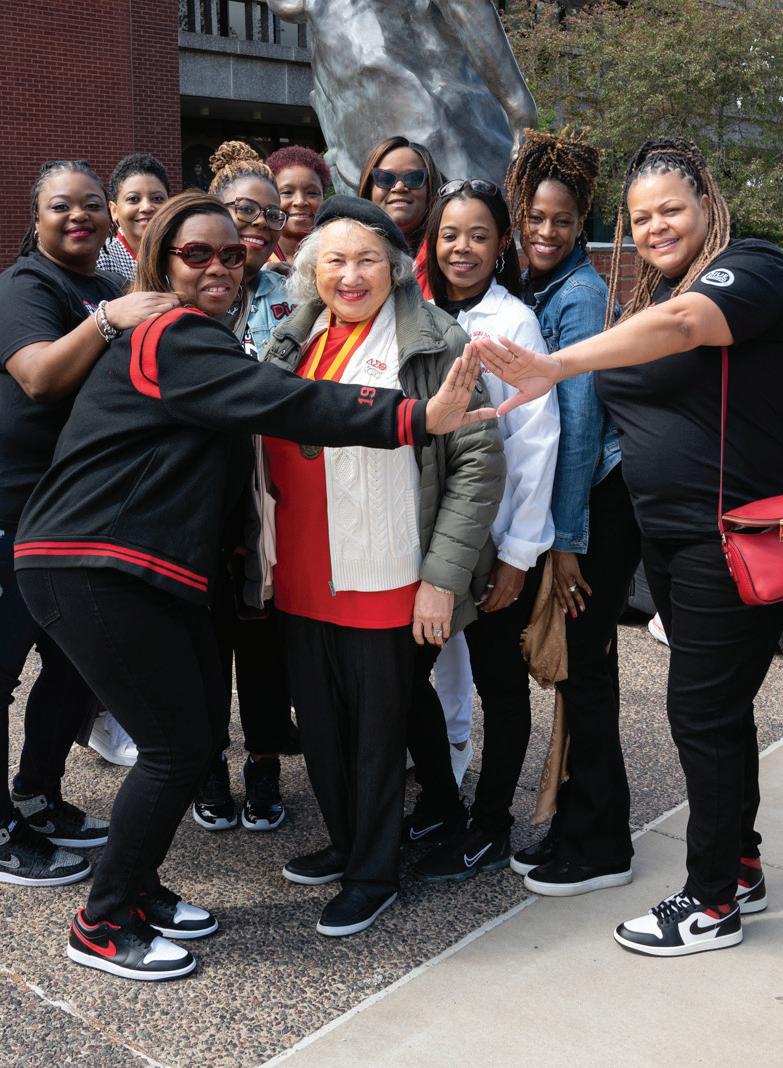 Photo (left): Karen Morris Watkins, ’66, a charter member of Delta Sigma Theta Sorority, Inc.’s Epsilon Xi Chapter, surrounded by generations of her sorority sisters during SIUE’s 2023 Black Alumni Weekend. Photo (above): The family and friends of Karen Morris Watkins accepted her posthumous award and celebrated her impact at the SIUE Alumni Hall of Fame ceremony. Photo (below): Karen Watkins, ’66, and her husband, Dr. Garey Lynn Clifford