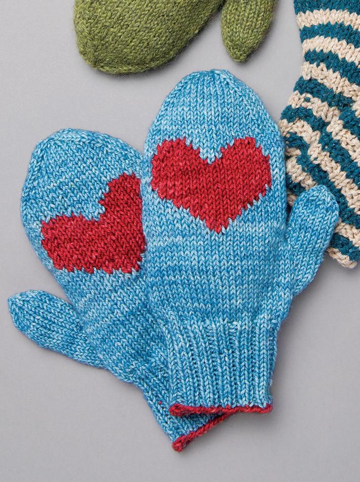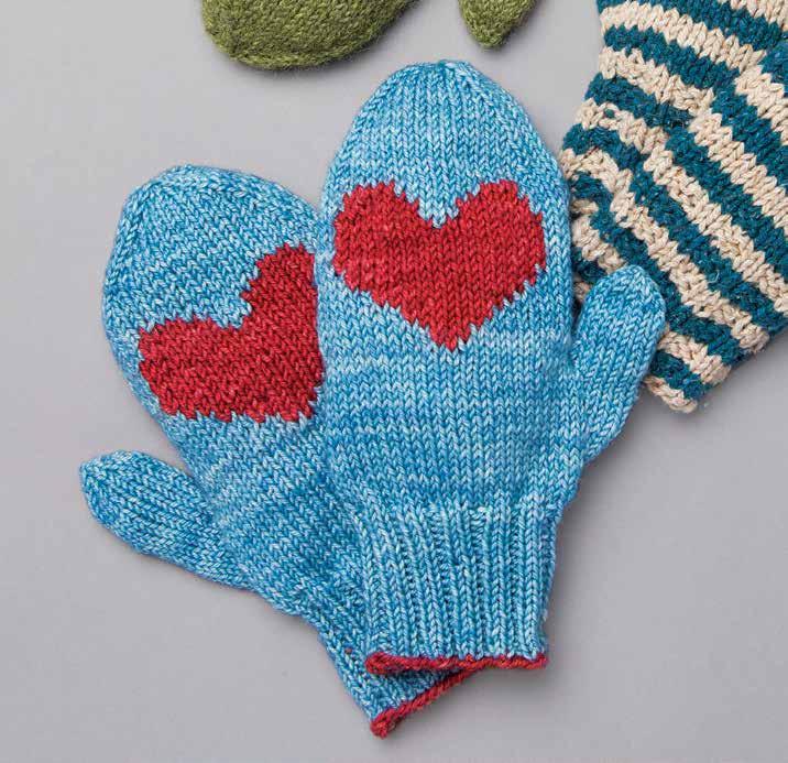 Note Chart is worked in St st. Change to straight needles and work next 18 rows back and forth as foll: Row 1 K to marker, sl marker, work chart over 23 sts, using 2 separate balls of A. Complete as for right mitten. ■