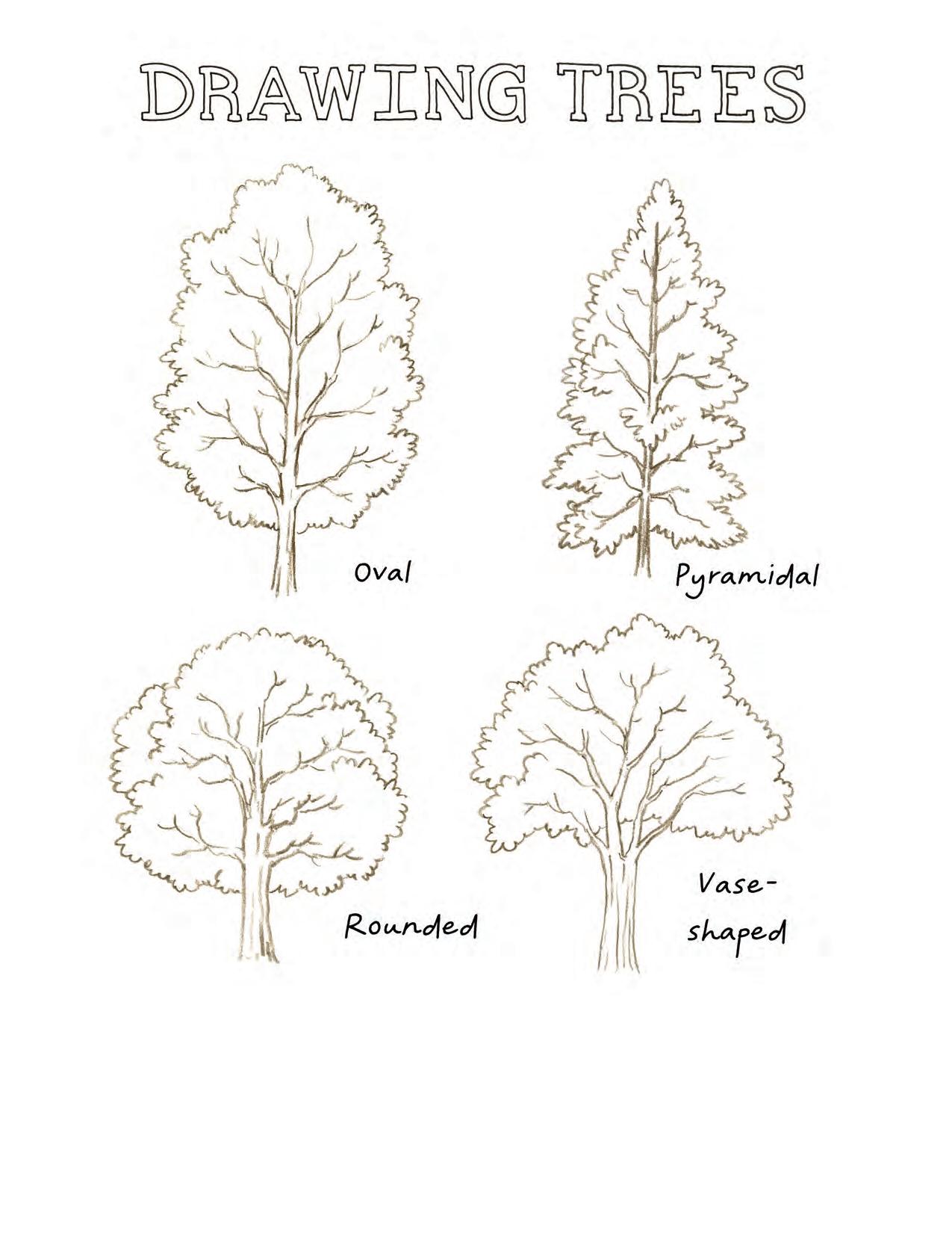 It’s tempting to draw all trees as just a simple trunk with a ball on top, but your drawings will look better if you add variety and a more refined shape. There are several basic tree shapes to consider.