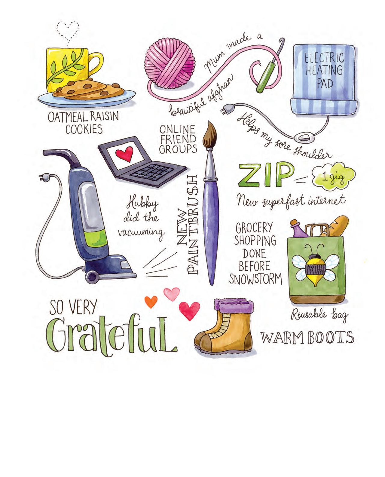 Practicing daily gratitude can reduce blood pressure, benefit your immune system, and have a therapeutic effect. Simply jot down a few items each day that made you happy. Your pages can be as simple or as complex as you like. Focus on each day and the pleasures you experience.