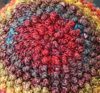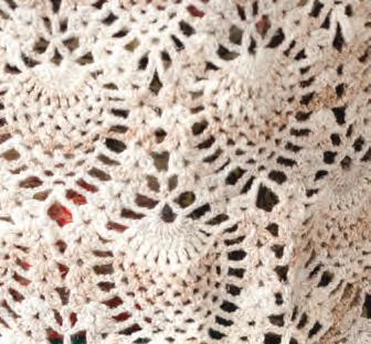 Inspired by Japan’s famed cherry blossoms, each motif is crocheted from the center outward with the white sections worked from the underside to create the raised “petals.”