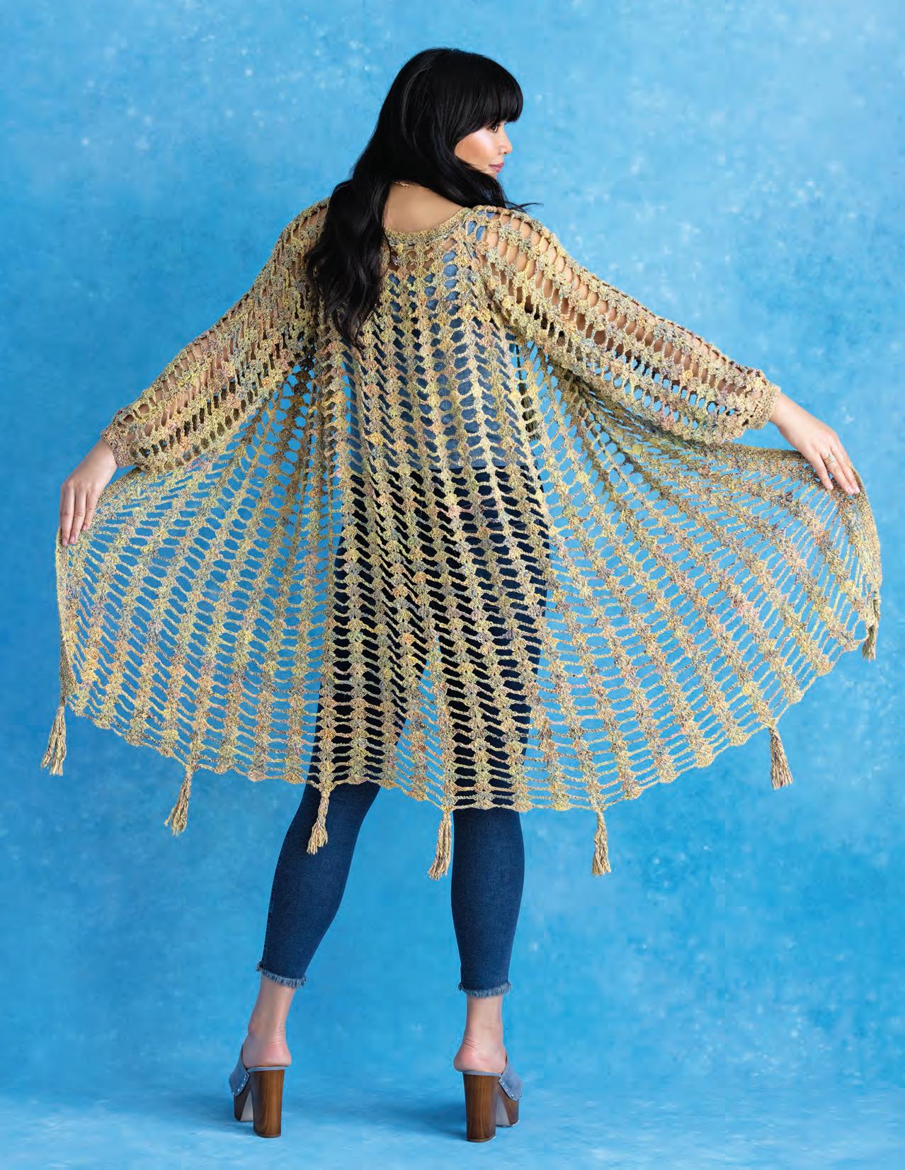 Worked in one continuous piece, this swingy cardigan uses a doublecrochet shell-pattern to create a kaleidoscope of rich earthen tones.