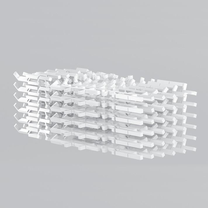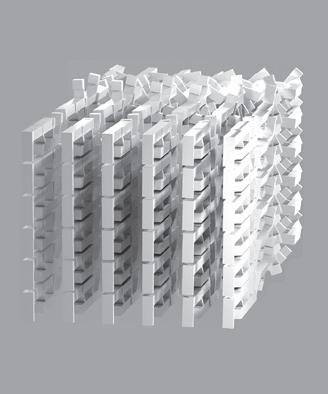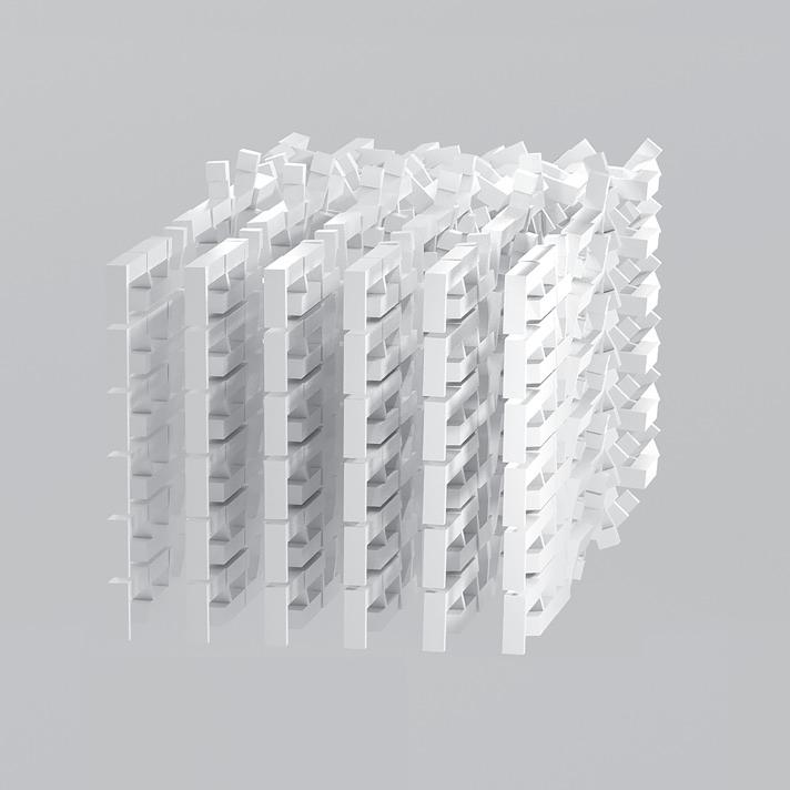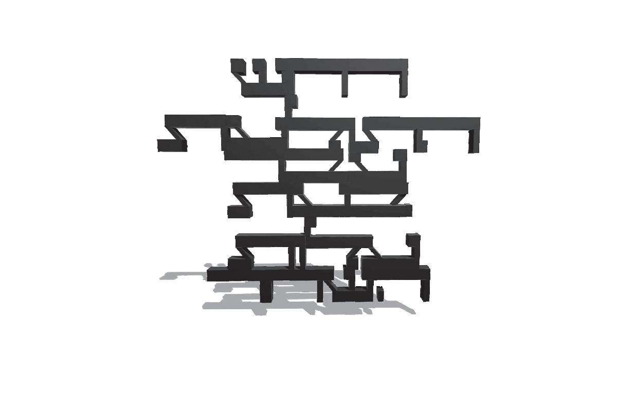 An examination of the letters as a threedimensional construction was initially undertaken by situating them on a single plane. In architectural terms, this strategy is called “three-dimensions in two-and-a-half dimensions,” since the transition from two dimensions to three dimensions does not exploit the full spatial potential, but is rather limited to the extrusion of forms. Franco did not make do with a restricted three-dimensionality, and explored the option of giving full three-dimensional expression to each letter, by dismantling them and locating the atoms in space to create a different spatial expression for each of the letters.fig. 9 He then went further by enabling the replication of the atoms to endow them with a new visual appearance. In this case as well, Franco stuck to set principles in treating the atoms: their replication and location in relation to one another involved an examination of the angles at which they rotate, the centralized