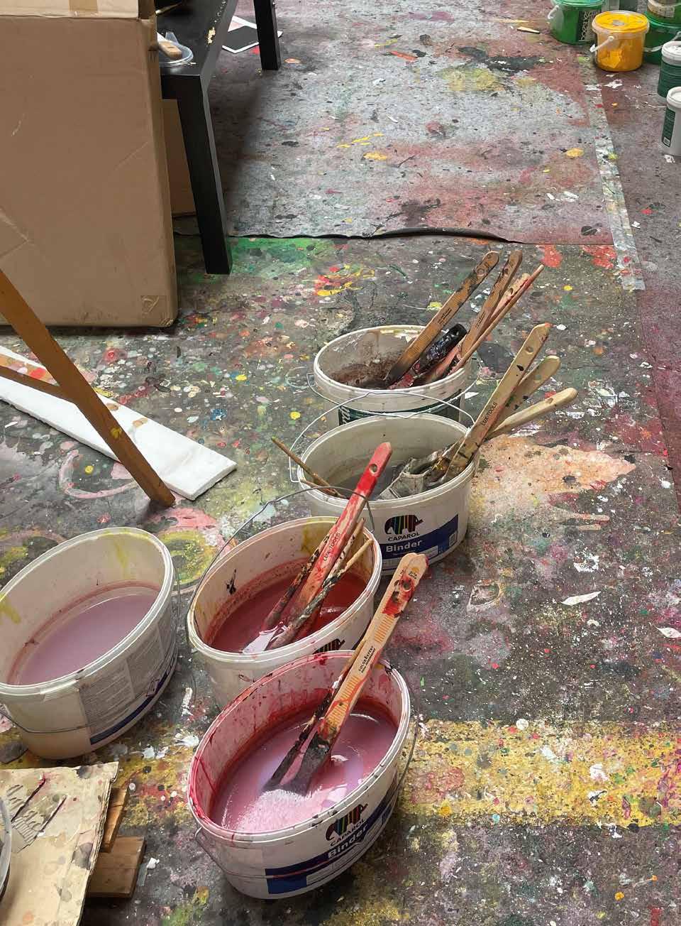 it has meaning. The same goes for the French calligraphy artist Fabienne Verdier. She uses a huge brush and has to use her whole body to move it. Kazuo Shiraga is a Japanese painter who paints while bouncing on a rope. I like it because it’s a crazy idea, but they prove you can do it and be successful with it if you just keep going. Each of them involves their bodies, space, and gravity, and that’s what I like about them. I really need inspiration like this. I think sometimes you can go deeper and try more niche or weird things. To some, it might look or sound stupid, but that’s where the beauty is. When it’s well done, it can make sense. This is just my opinion, but maybe many people are in a rush because there is so much to see in the world, like advertising, and sometimes they have to force themselves to go to a place where art is displayed, like an exhibition. It’s a space to relax and think about how the art is made, what the intention behind it is, and simply appreciate the work. I remember when Agnes Martin and Jackson Pollock met in New York. They said that music doesn’t need an explanation to be enjoyed, but visual art often does. It can be difficult for people to connect with art because they feel like they need an explanation. Art requires repeated viewing to truly understand and appreciate, while music provides an immediate emotional response. I think we need all kinds of visual art, music, dance, and theater. It will do good for everyone.