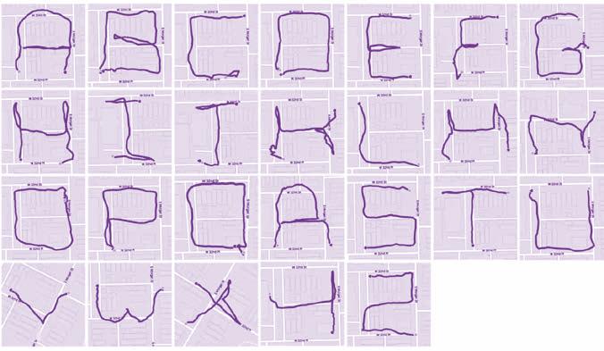 The work of Audrey Gatta, who created letters by running around her neighborhood block and recording the path using the Strava app.