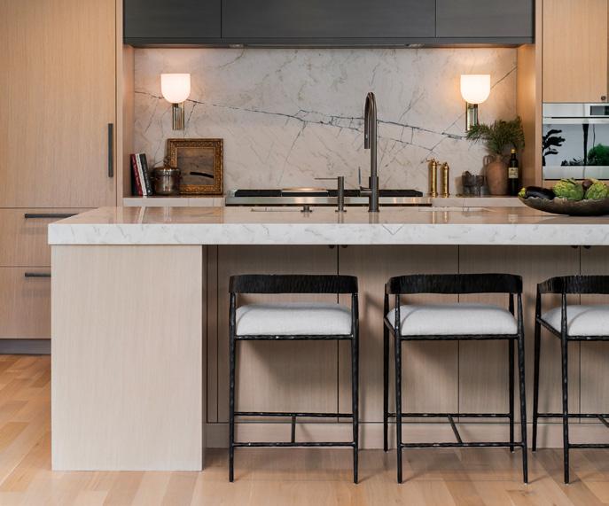 into one cohesive surface, and Young Brothers Inc. installed a waterfall countertop in Fantasy Lux Quartzite to complete the look.