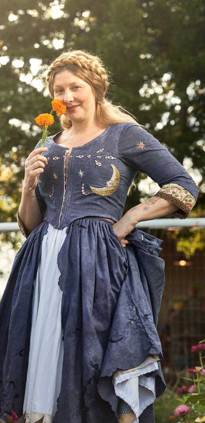 I am really interested in traditional crafting, and make clothing inspired by folk garments using recycled materials. My focus is on imitating the working-class functional garments from pre-industrial times, specifically corsets but also bloomers and petticoats. I’m not interested in court clothing or dressing the queen, but more in dressing a laborer, like a harvester. I focus on patterns meant to be comfortable for a whole day’s physical work but also to look amazing. These garments are washable and can be worn in everyday life.