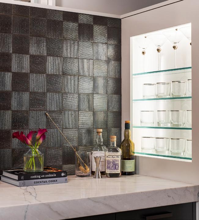 Shinju Olympia Glazed Tile from Classic Tile adds texture to the bar.