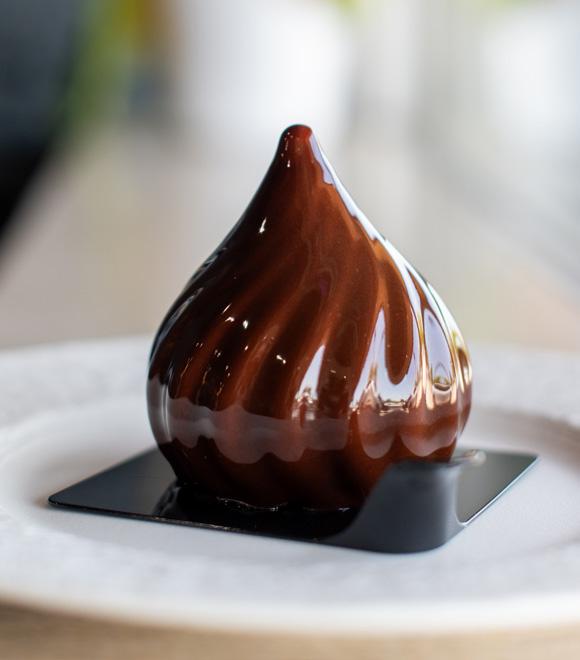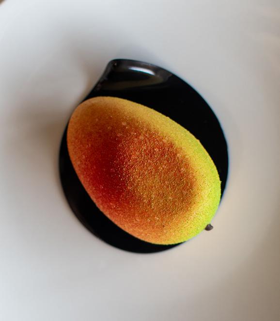 L'Arc Patisserie's Mango Petite dessert. Chocolate shell, Mango mousse, Mango compote, Joconde sponge. Photo by Rachel Maucieri.