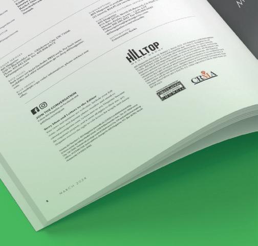 clarity. 405 Magazine Volume 10, Number 6, June 2024. 405 Magazine is published monthly by Hilltop Media Group at 1216 N Blackwelder Ave., Suite 13, Oklahoma City, OK 73106, 405.806.0672. ©Copyright 2024 Hilltop Media Group. All rights reserved. Reproduction of 405 Magazine content, in whole or part by any means, without the express written consent of the publisher is strictly prohibited. 405 Magazine is not responsible for the care of and/or return of unsolicited materials. 405 Magazine reserves the right to refuse advertising deemed detrimental to the community’s best interest or in questionable taste. Opinions expressed in this magazine are those of the author and do not necessarily re ect those of ownership or management. Basic annual subscription rate is $14.95. U.S. single-copy price is $4.95. Back issues are $9.50 each