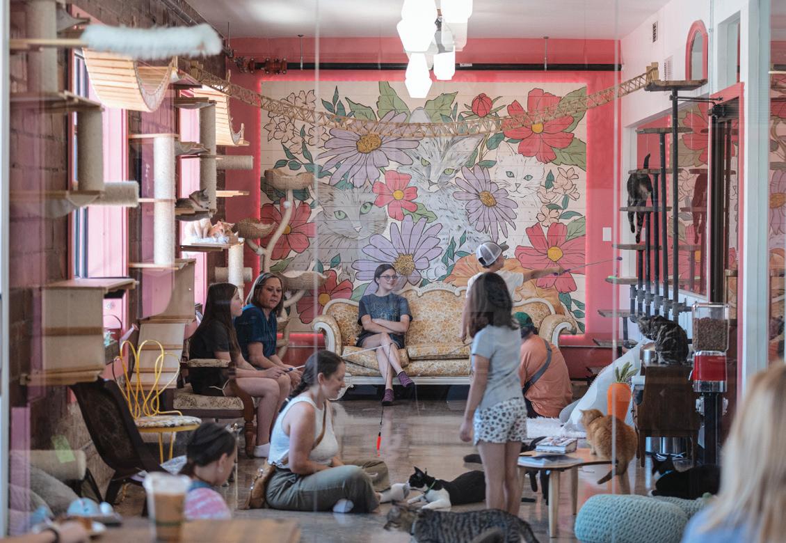 IN MAY, OKLAHOMA CITY WELCOMED ITS FIRST CAT CAFE, TO the delight of ailurophiles — cat lovers, that is. Don’t Stress Meowt Cat Cafe combines quality time among a flock of felines with a selection of food and beverages creating a haven for cat lovers and coffee shop enthusiasts alike.