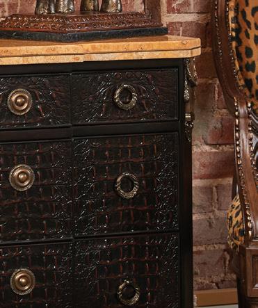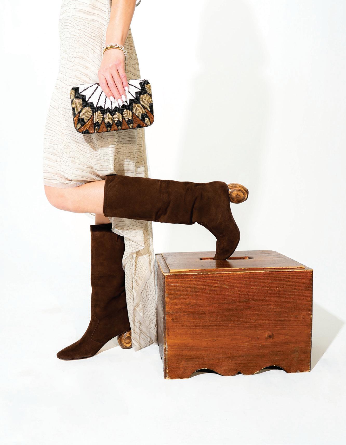details, and we would agree. Details can take your look from fi ne to sublime and add an element of romance that will surely cause sparks. Dark jewel tones draw the eye and create a warm, inviting air. Setting the scene is important, and a leather base is a spicy and sophisticated way to start. Like in any relationship, the small things count. Beads are the perfect way to capture attention, and a distinct heel will have everyone doing a double take, as they should.