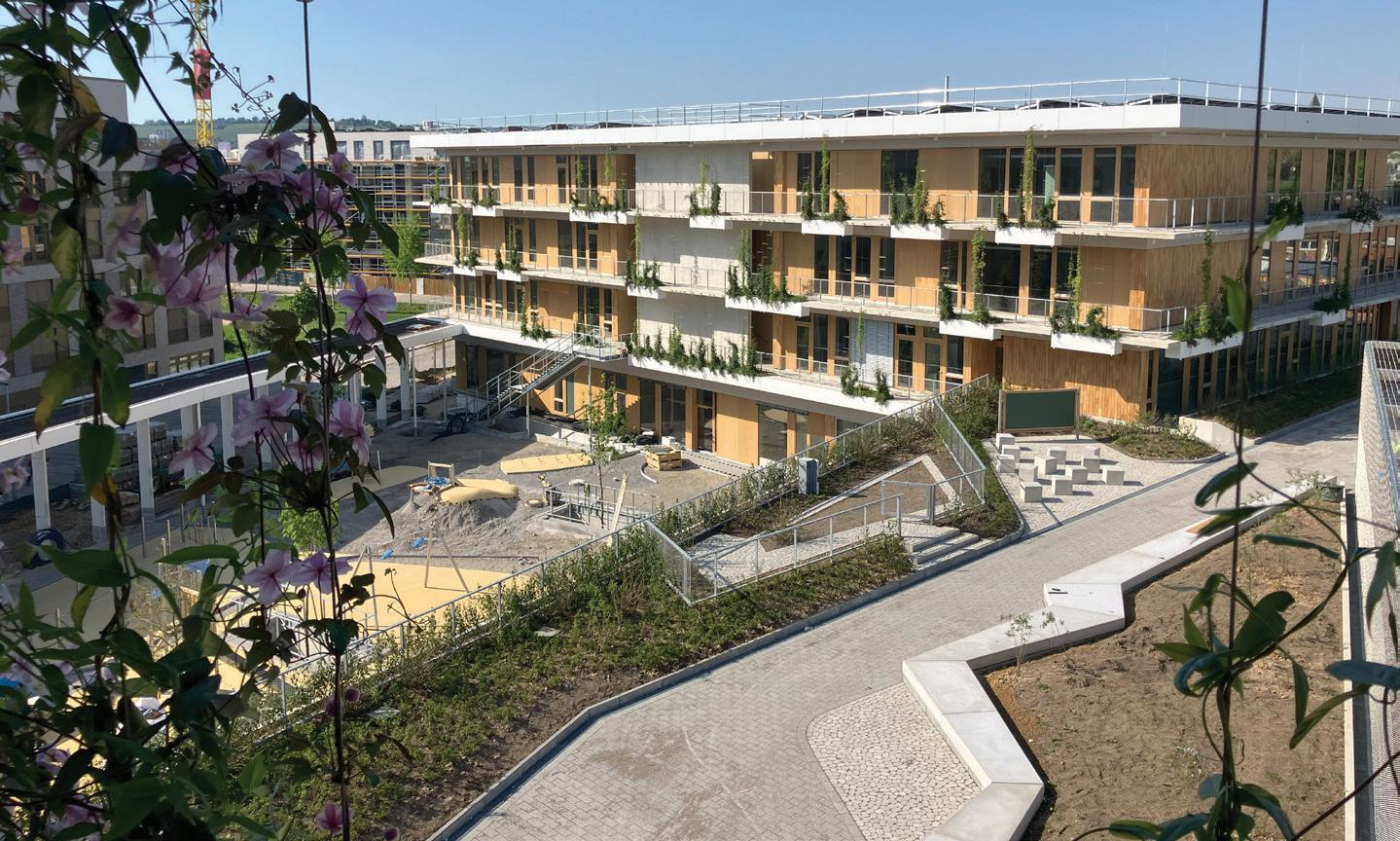 minimieren Wärmebelastung und Kühlbedarf. Begrünte Fassaden, große Freiflächen mit intensiver Begrünung und leistungsfähige Rückhalteflächen sorgen für ein mildes lokales Mikroklima und sind wetterfest gegen starke Regenfälle.