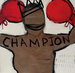 As a fellow breast cancer survivor— 15 years cancer-free at the time—she was drawn to Champion, a painting that depicts a victorious female boxer with a prominent mastectomy scar (view the painting on pages 3 and 21).