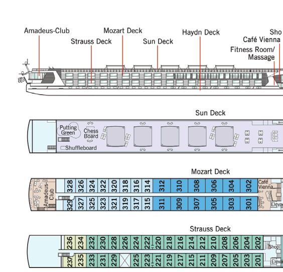 With Smithsonian Journeys, you’ll often find yourself aboard an Amadeus river ship. Accommodating just 120–168 guests, with space reserved for 25 to 75 Smithsonian guests (depending on the departure), these riverboats are stylishly appointed with all the modern amenities. Meals are served in a single unassigned seating in the elegant restaurant and showcase continental cuisine, with complimentary wine and beer served during lunch and dinner. Style and comfort can be found in all guest cabins, many with large windows that allow private views of the passing scenery. Guests can enjoy a panoramic deck lounge, a variety of large and small public areas and bars, a library, a salon, and a fitness studio with spa services. Wi-Fi is complimentary aboard each ship. The staff members and crew often hail from all over the world, and are known for their friendly and efficient demeanor. You’ll find a similar ambiance and amenities aboard the all the ships we sail.