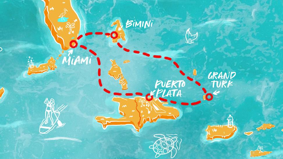 Miami, Grand Turk & Back sails to the snow-white shores of the Grand Turk for plenty of time to lay by the beach and explore the city streets. Add a full day spent at the exclusive Beach Club in Bimini, Bahamas.