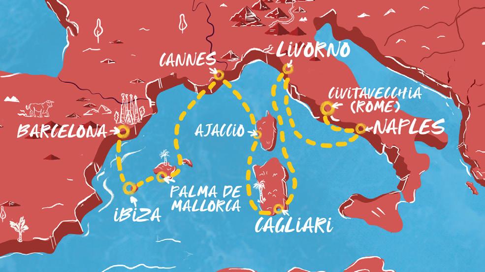 This 12-Night journey departing from Barcelona spends two days of fun in the sun and stars of Ibiza before docking in Palma de Mallorca and then sailing to Cannes, Ajaccio and Cagliari. Spend another day sailing to Livorno, the gateway to Tuscany’s beloved capital of Florence and iconic Pisa. Finally, spend a day sailing to breathtaking Naples before arriving in your final port of Rome.