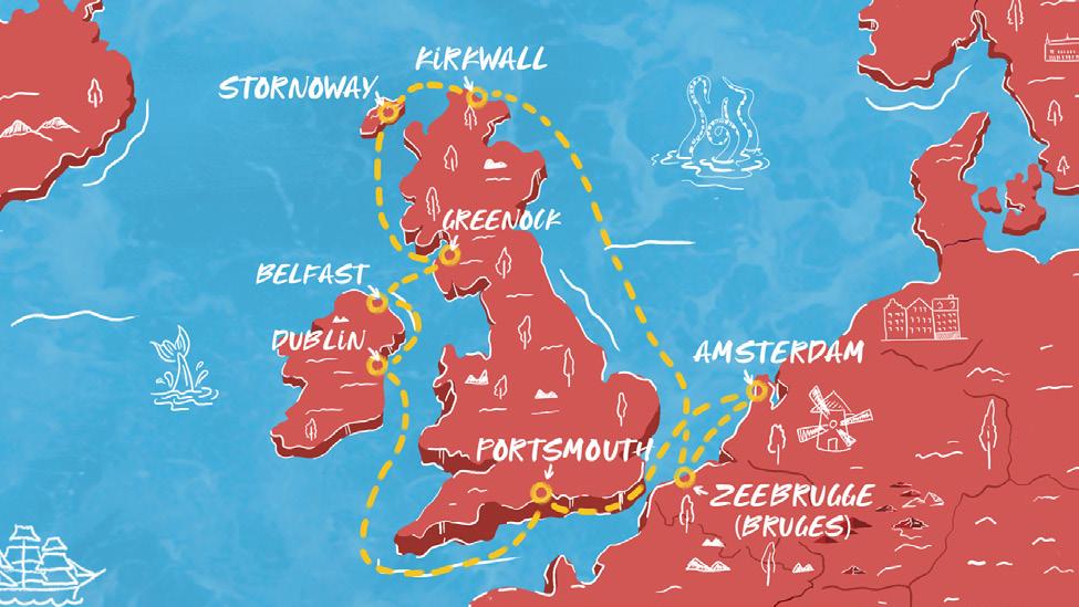 This 13-night dreamy voyage sails from Portsmouth and first docks in the capital of art and architecture, Amsterdam for two days of excitement and exploration before hitting Bruges, Belgium. You’ll then spend a day sailing to Kirkwall, then Stornoway, Scotland. Then, you’ll sail to Glasgow followed by Belfast, and one more self-care day at sea heading to Dublin before sailing back to Portsmouth.