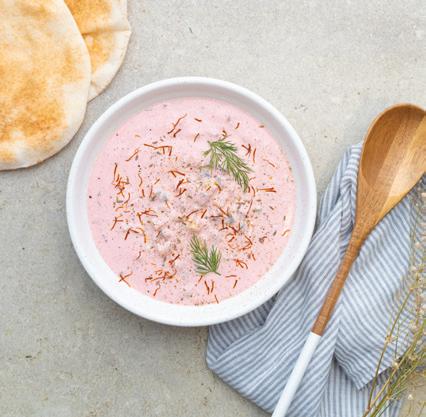 Opposite page: Lentil Dahl with Flatbread and Grilled Sea Bass Tacos with Red Cabbage and Pomegranate. This page: Bakery Assortment; Pink Tzatziki, Lebanese Pita and Iranian Saffron; and Fresh Fruit Bowl and Crunchy Quinoa. All by Chef Aymeric Halbmeyer.