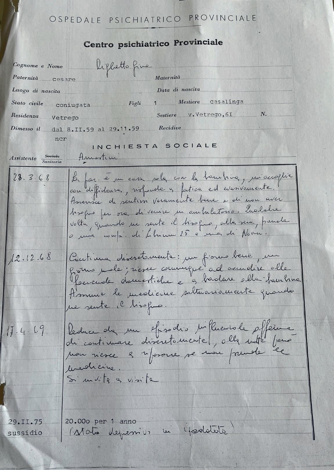 "Dans le dossier médical de grand-mère Gina, j'ai trouvé la date du 14/02/83... le psychiatre qui l'a prise en charge a demandé son admission à l'hôpital de Dolo (une commune italienne de la province de Venise, Italie) dans le service de psychiatrie, où il a écrit : "La patiente est de nouveau malade, elle ne dort pas la nuit et erre, colère, émotivité... !" ma mère a donc été convaincue d'être admise et d'entreprendre une nouvelle thérapie.