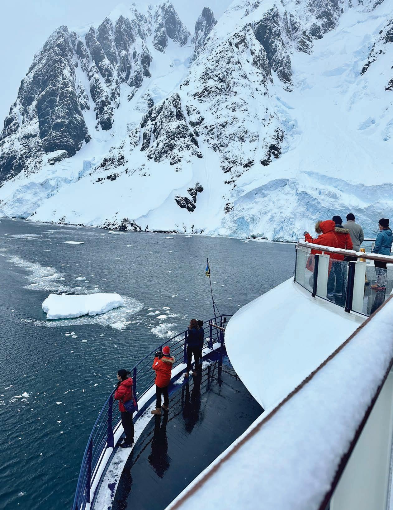 The following morning's short charter flight to Ushuaia, the capital of Tierra del Fuego, provided a stunning aerial view of the dense beech forest that blanketed Antarctica millions of years ago. A catamaran cruise of the Beagle Channel preceded our boarding of National Geographic Endurance , a 408-footlong, fully stabilized ship accommodating up to 138 guests. Launched in 2021, Endurance was purpose-built for polar navigation and has a patented X-bow that slices through waves to provide a smooth ride.
