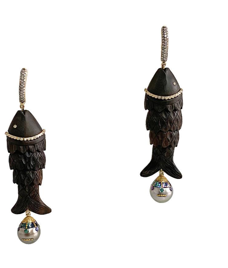 This page, clockwise from top left: Oscar Heyman gold and opal swordfish brooch. Available through Moyer Fine Jewelers in Indianapolis, Chesterfield Jewelers in St. Louis and oscarheyman. com. Mindi Mond turquoise and diamond snake pendant necklace (mindimondny.com). Arnold & Son Perpetual Moon 41.5 red gold “Year of the Snake” (arnoldandson.com). Jonne Amaya snake hoops (jonneamaya.com). Bea Bongiasca Albino Burmese Python Tarallo earrings (beabongiasca.com). Renato Cippulo Iguana cuff bracelet (renatocipullo.com). Jacquie Aiche snakewrapped pink tourmaline flower ring (jacquieaiche.com). Lionheart Jewelry Nouvelle serpent ring (lionheartjewelry.com). Anita Ko Snake Coil bracelet (anitako.com). Sorrellina Victoria serpent ring. Available through Reis-Nichols Jewelers in Indianapolis and sorellinanyc.com. Fish earrings from Silvia Furmanvich's Quintessence collection (silviafurmanovich.com). Jade Trau Scarab charm (jadetrau.com). Opposite page: A collection of rings from Maison H Jewels Brushed Crocodile Mouvante collection (maisonhjewels.com)