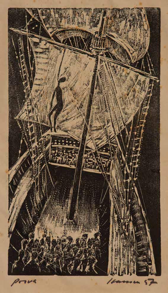 NAvio Negreiro conjunto de seis provas de xilogravuras impressas s/ papel para o livro “Navio Negreiro”, de Carlos Alves, e “Caminho de Lágrimas”, de Hansen Bahia (originalmente com 27 provas), todas ass., dat. 1957, com inscrição “prova” e algumas n. com algarismos romanos todas catalogadas com BR da Galeria Bonino colofon ass. ass. e com inscrições “provas manual” e “gravura nº 1 – 28” medidas diversas