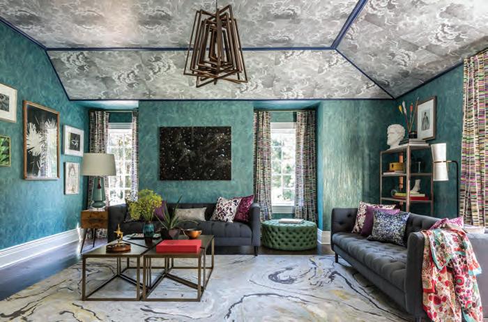 By Apartment 48. While contemplating this design, Rayman Boozer channeled the romance and creativity of the Bloomsbury Group to create a retreat fit for a troupe of freethinking authors and artists. Or anyone ready to put their feet up for the weekend! The stage is set with The Rug Company’s "Marble" area rug featuring organic swirls of light and dark that whimsically reflects the Cole & Sons’ "Nuvolette" wallcovering on the room’s tray ceiling. Rayman uses organic notes and jewel-tones to round out this bohemian paradise. Photography by Marco Ricca.