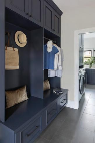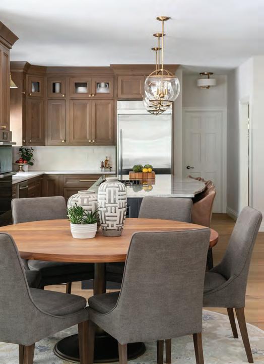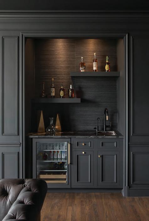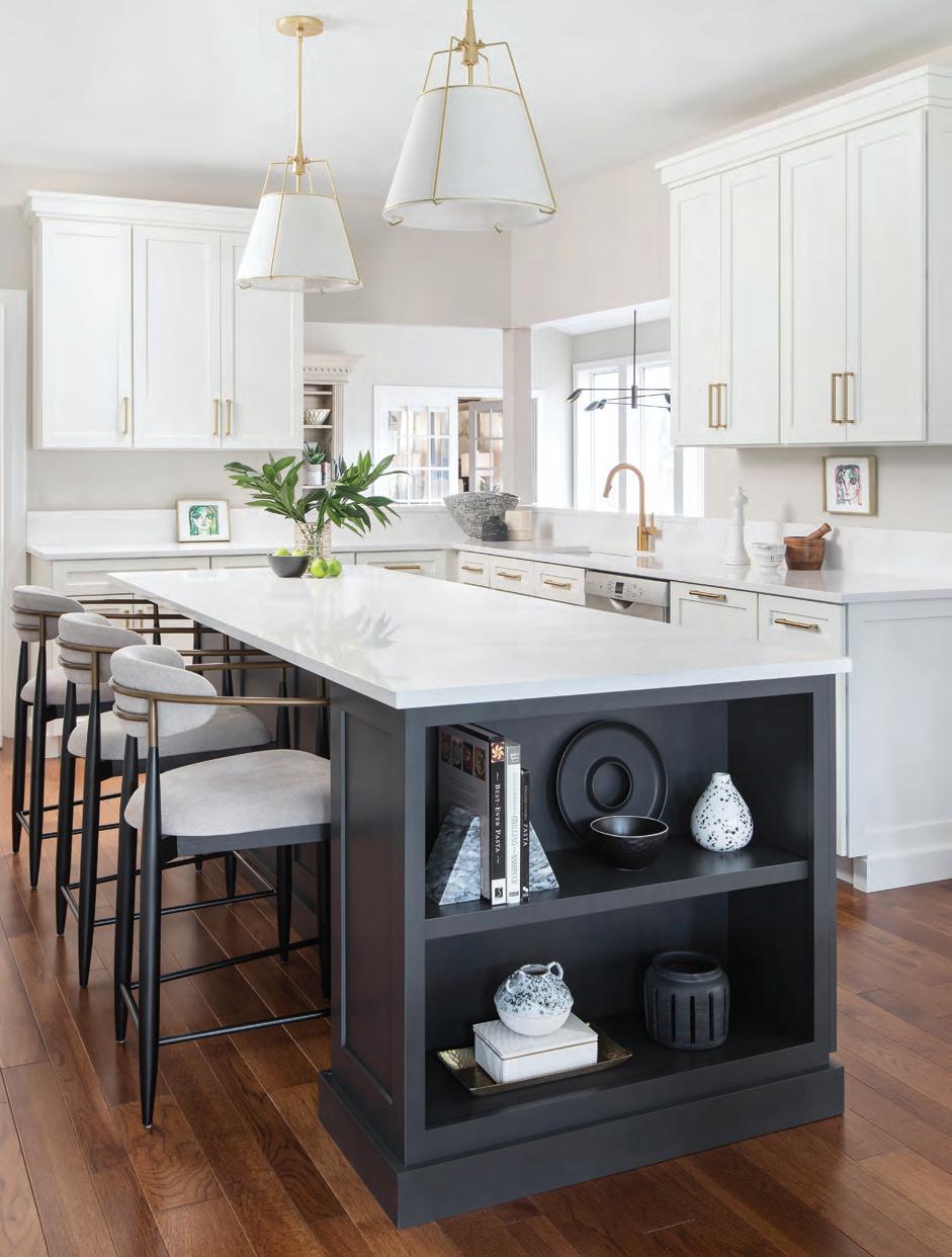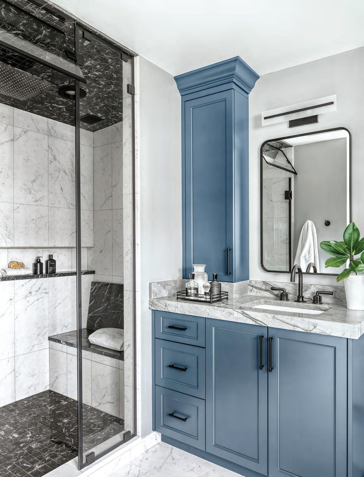 to each have their own storage space in the bathroom. Black-lined rectangular mirrors sit above the vanities and are lighted by minimalistic, rectangular lighting. Overall, Alspaugh Kitchen & Bath was able to accommodate the client’s vision and goals for the space. More storage, a calming atmosphere and separate toilet room, shower and tub were added to the space through substantial changes. “The final project depicts a beautiful space that was achieved through calming colors, ambient lighting, softly balanced patterns and functional design,” says Chris. See stlouishomesmag.com for resources.