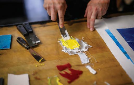 Art can take on many different approaches and styles. Ken Wood, an artist and professor at St. Louis Community College, combines relief printmaking, the more traditional process of printing, and collagraph printing, a process in which glue and fabric are used to add texture to a print. The end result under Wood’s artistic eye is a smattering of colorful shapes swirling across a white background.