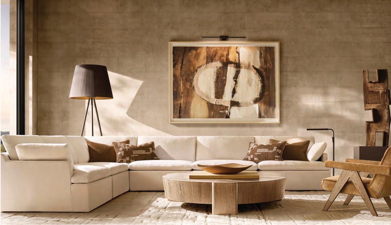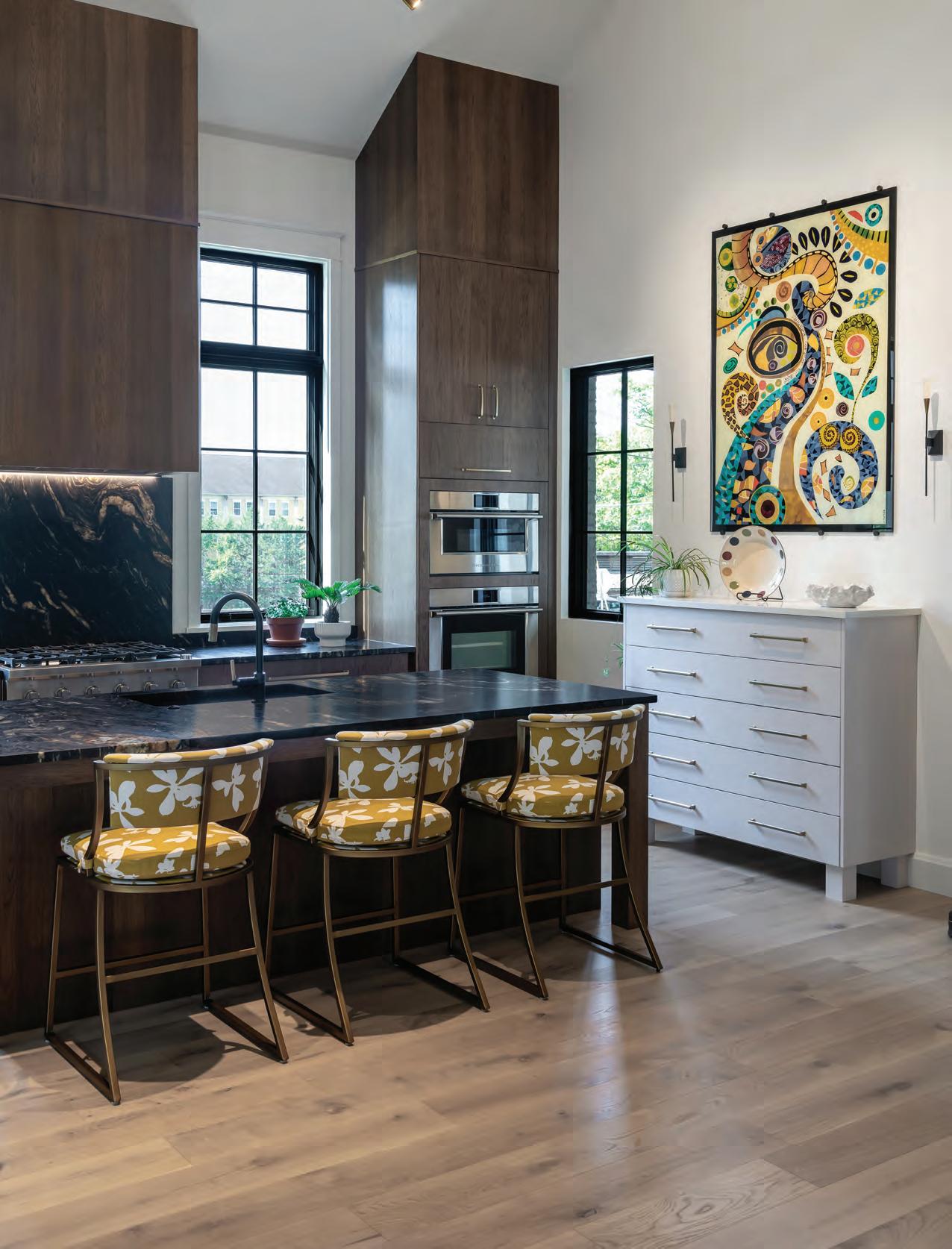 Overhead, exposed beams add structure without sacrificing the room’s airy feel. A sage green wet bar with artisan tile and copper sink invites effortless entertaining, while the seating— camel leather sofas, a cream-and-black bench and a wood coffee table—strikes the perfect balance of comfort and style. The diverse mix of pillows, coastal artwork from California and vintageinspired rug are each unique, yet share the warm, earthy color palette that unifies the space. “We focused on the small details that may not be super obvious but make the home feel finished and the design timeless,” adds Megan.
