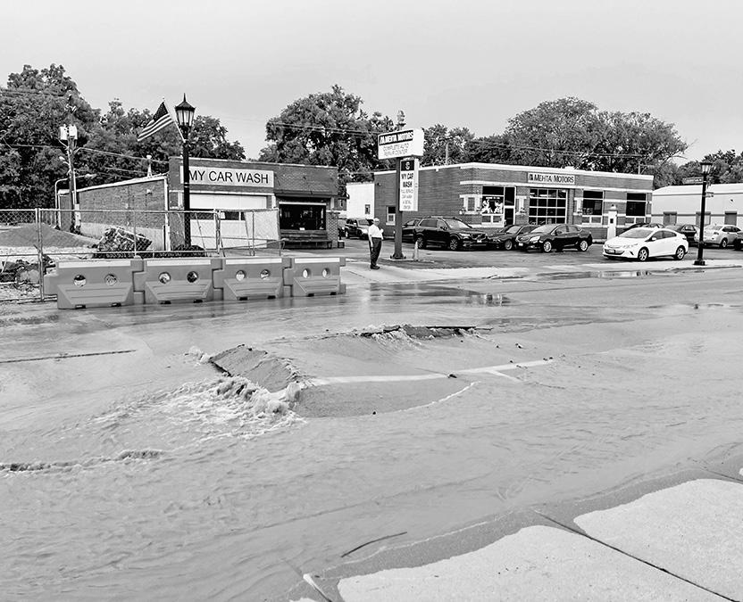 On Thursday, July 24, at about 4 p.m., a water main broke on Spring Road in Elmhurst, closing the street between St. Charles Road and Eggleston Avenue for several hours. Elmhurst Public Works Department employees worked late into the evening to repair the broken water main. One photo (above left) shows a pool of water at the corner of Spring and Eggleston. Another photo (above right) shows Hosi
