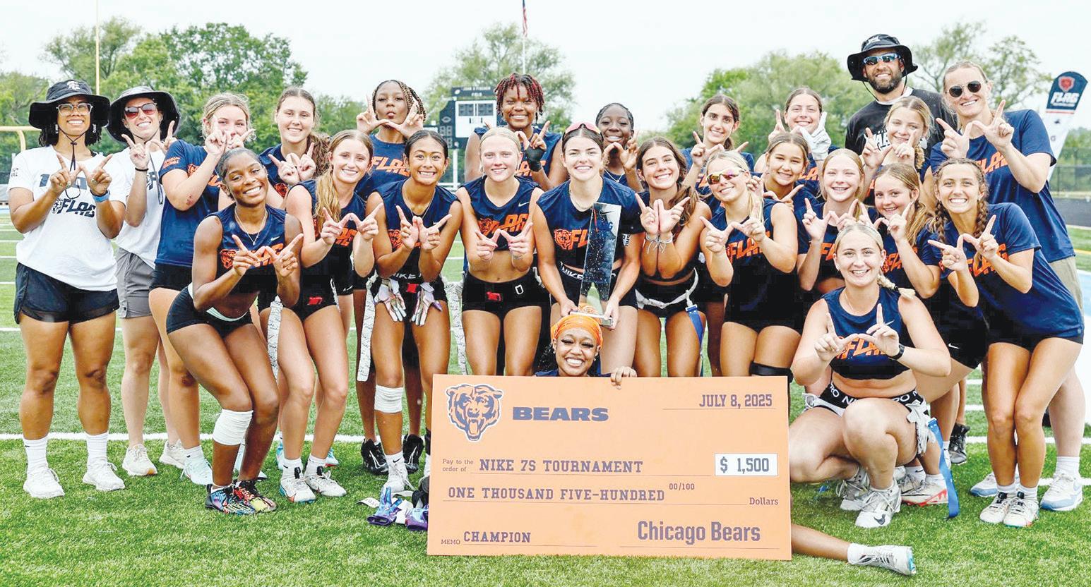 Willowbrook High School’s flag football team competed against 15 other teams in last week’s multi-day event at the Warriors’ stadium in Villa Park. The Chicago Bears joined Nike to host the event, which included individual skill competitions and seven-on-seven games. Willowbrook went undefeated in the seven-on-seven tournament. After winning three straight games in pool play, the Warriors advanced to the championship bracket, where they posted three more wins, including a victory over Chicago’s Taft High School in the title contest. The Willowbrook team is pictured with its championship trophy, along with a check for $1,500 to support the school’s flag football program. The Illinois